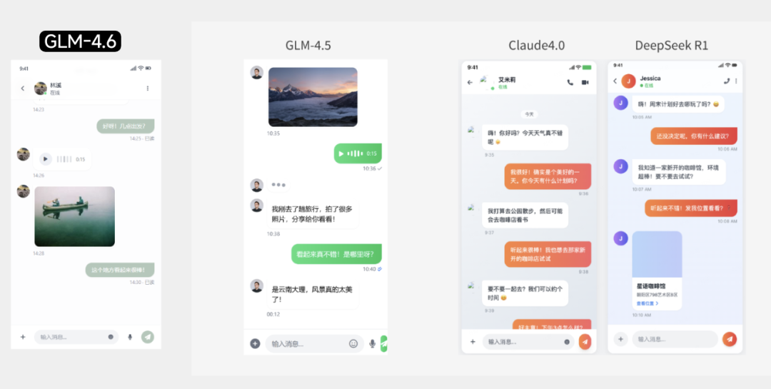 另一处细节是GLM-4.6生成的图在对话页面不仅与文字对话,还加入了语音消息类型,这也是之前几大模型包含GLM4.5自身也没有的。