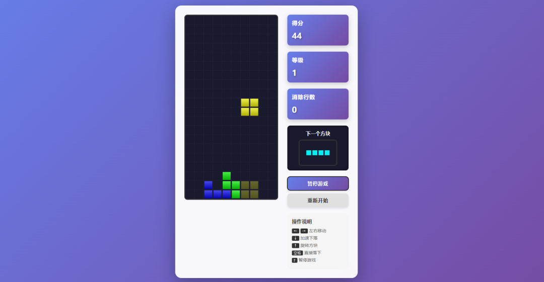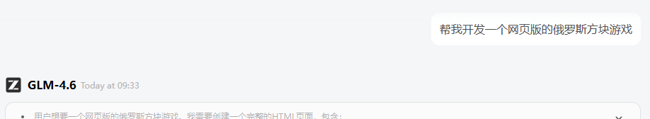 再来测试一下简单的网页游戏,这里还是先试试俄罗斯方块,只输入很简单的要求看看GLM-4.6能发挥到什么程度
