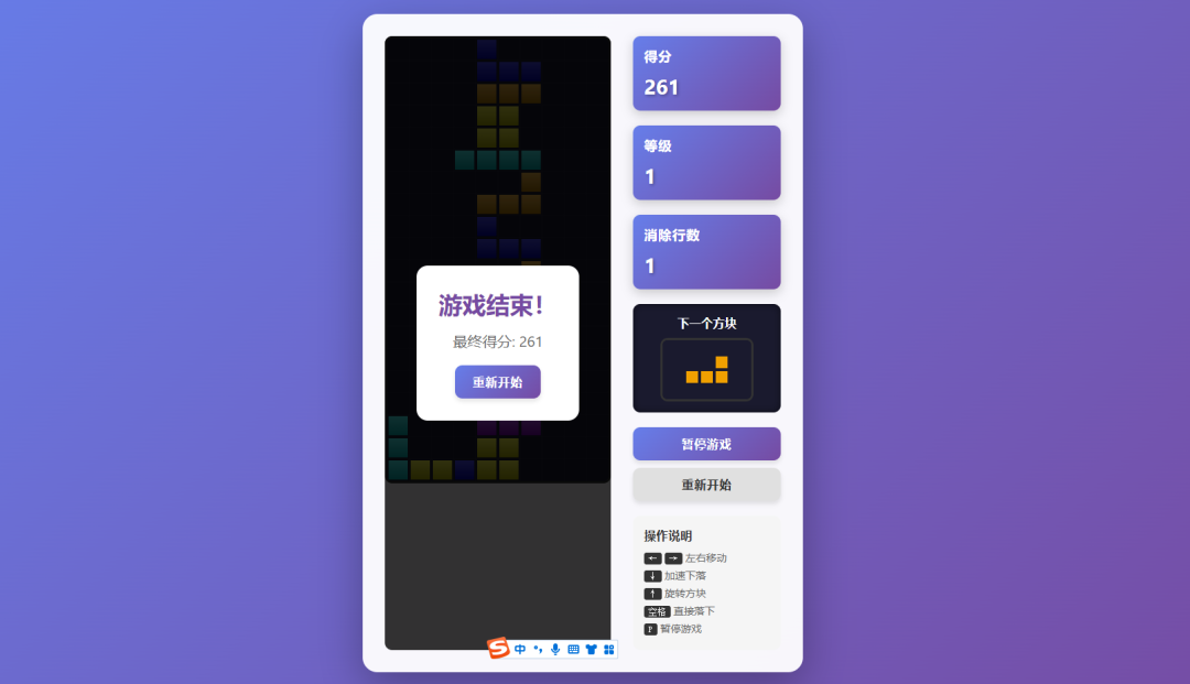 游戏结束之后的分数统计、重新开始引导也都是正常的,游戏界面中的操作说明也很完善。如下图