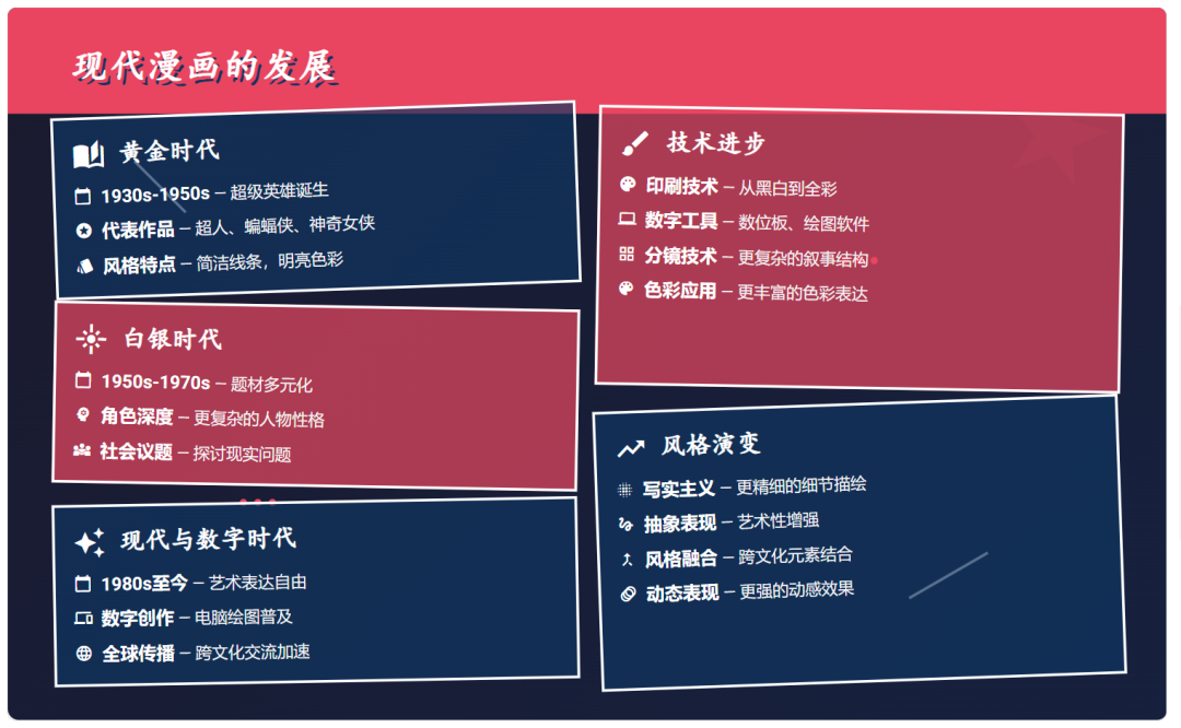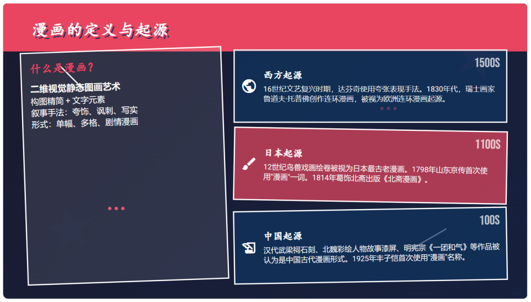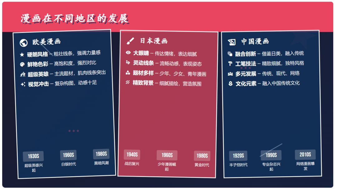 再来看另一份PPT,是关于漫画发展史的,并且指定了美漫设计风格