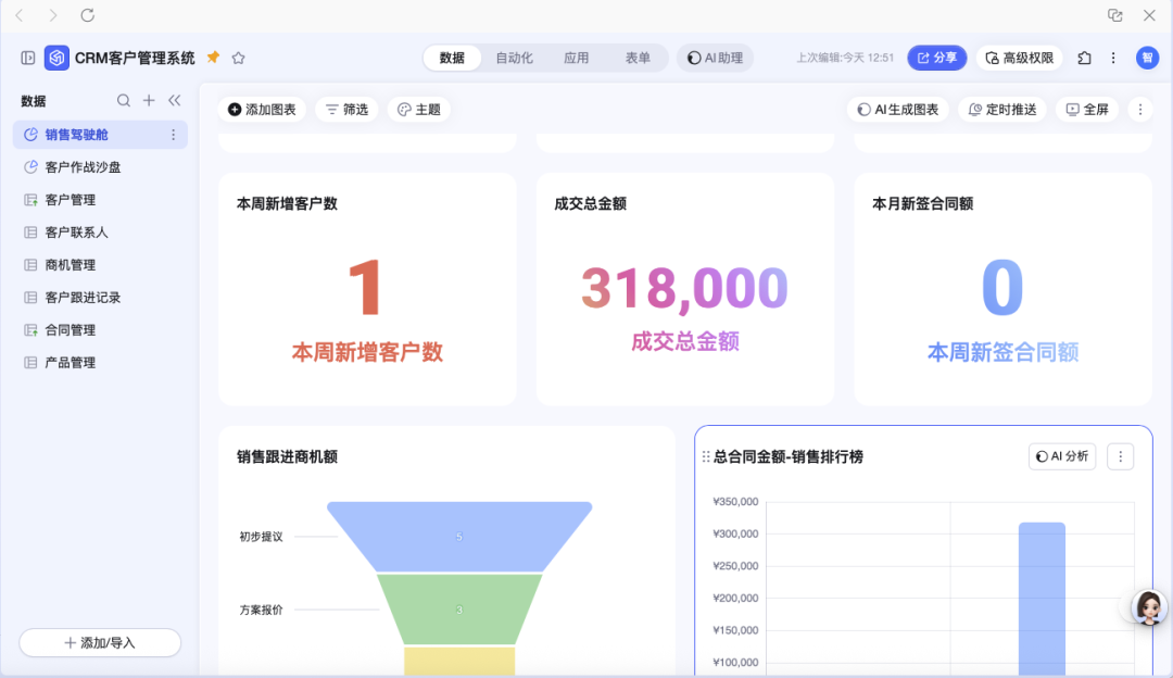 通过AI表格的数据分析看板,几分钟之内就把重要的数据分析指标做出来了,更让人惊奇的是,居然还有漏斗图,这简直就是CRM的绝配。