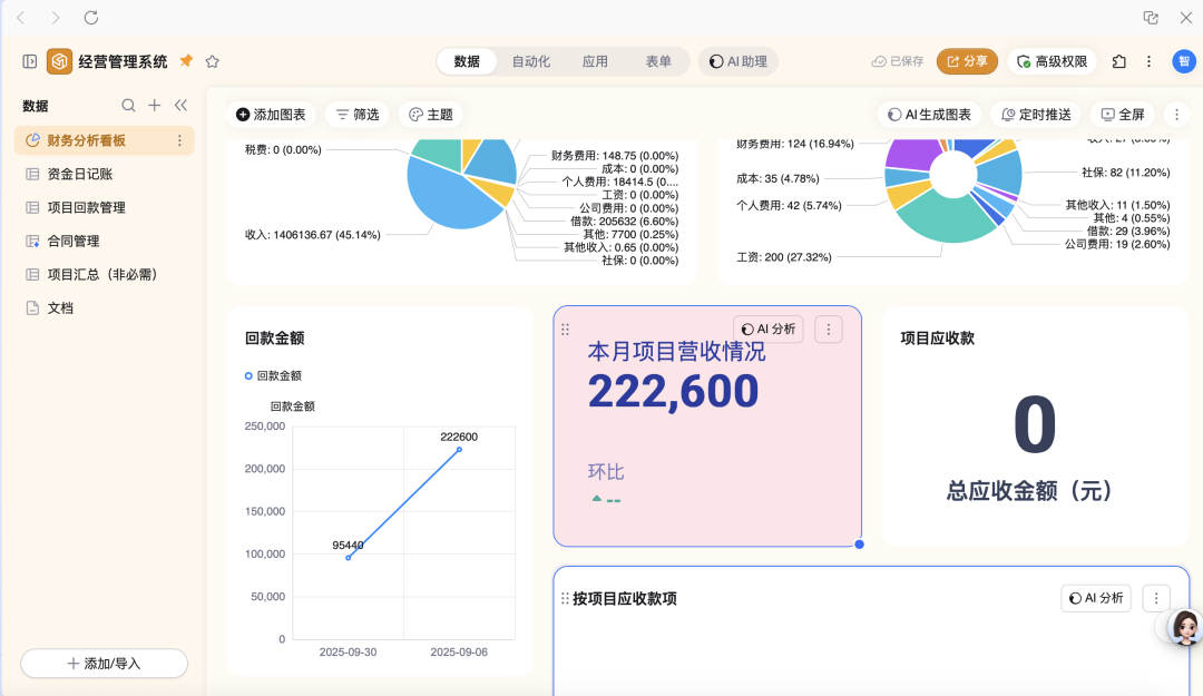 在这里,我们再次用到了AI表格的数据共享功能,只不过在这部分变成了导入【合同管理】,这样就可以在项目回款管理以及财务的收入和支持和对应的合同进行关联。