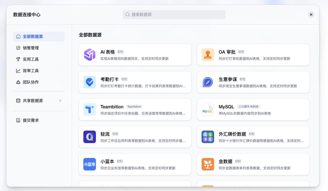 更为强大的是,钉钉将数据共享做成了生态,除了AI表格本身的数据可以共享之外,一些外部应用也可以共享,并和AI表格进行集成。以前跨系统做数据打通成本极高,甚至不可能的事情,现在钉钉的数据连接中心却帮我们实现了,怎么能不爱呢?