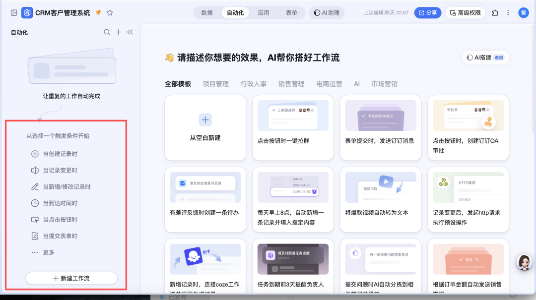 我从AI智能表格的模板库中发现好几个成型的CRM的模版,选了一个比较匹配的直接复制过来,然后根据我们团队情况进行删减和调整,一个AI表格版的CRM系统一个小时内搞定,界面简洁直观,所有团队成员都能轻松上手使用。没有授权数量限制,每个人都可以随时查看和更新客户信息。