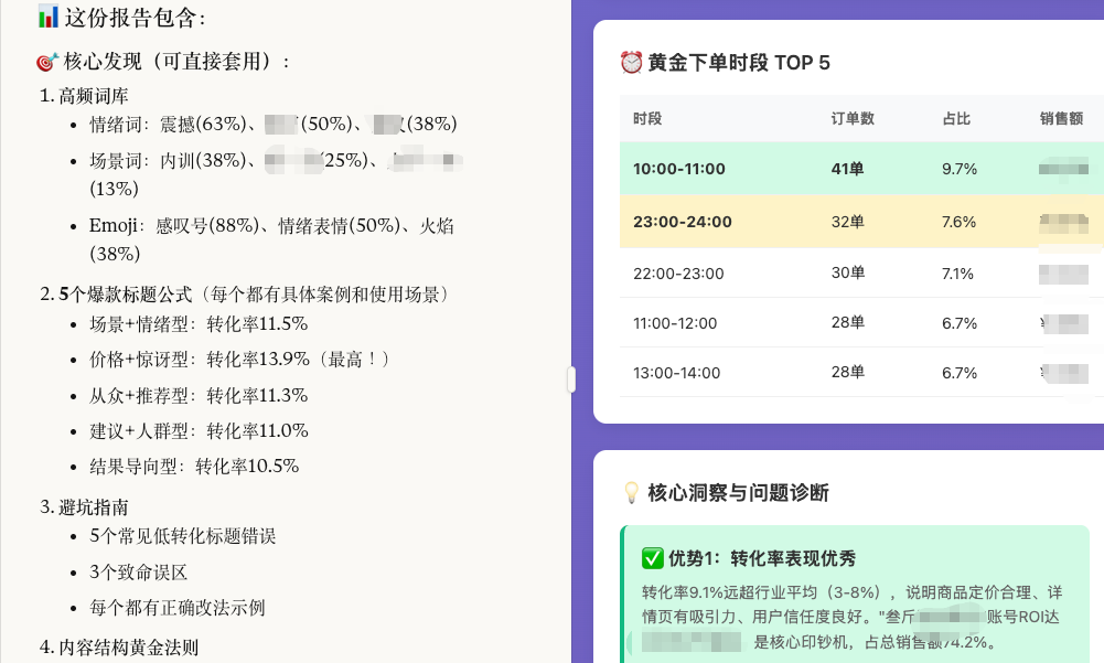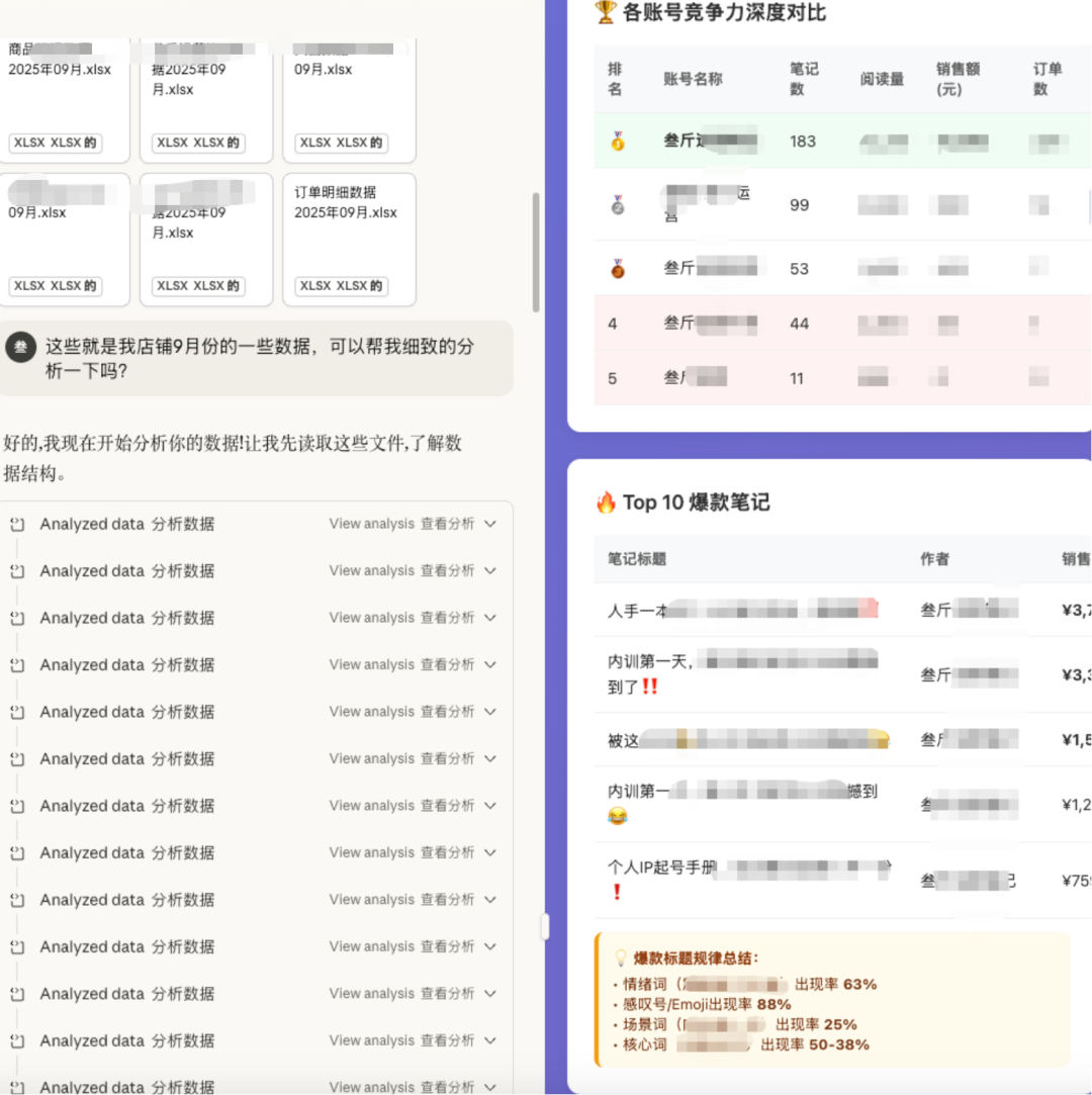 你只需要把订单详情、笔记详情等数据导出给AI,就能自动帮你分析。你还可以跟他说:以可视化 html 格式输出。