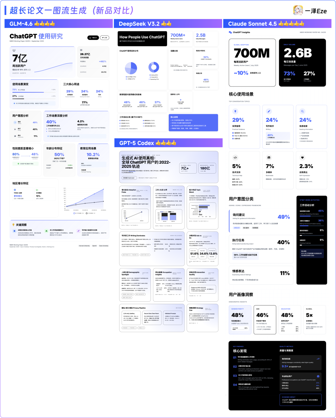 Claude Sonnet 4.5:在布局结构、自主设计感上最具优势,详略得当(不过出现了一处数据幻觉,可以接受)