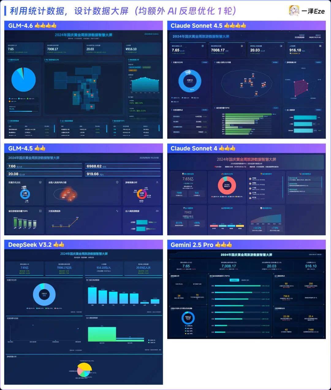 在这波 9 月底的模型扎堆迭代的“神仙打架”中,再回头看 GLM-4.6:经典长文一图流测试中,GLM-4.6 的综合表现稳压过了 DeepSeek V3.2 新品与国内其他模型,比肩 Claude 4,甚至能与 GPT-5 Codex 有来有回在本轮贴近商业开发场景的数据大屏测试中,甚至与 Claude 4.5 相比也不逊色,更是明显优于前代模型