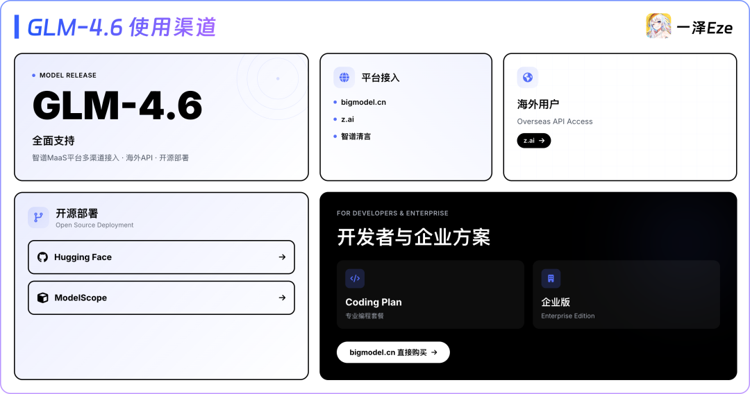 C 端对话:z.ai 、智谱清言已全面支持 GLM-4.6API 使用:国内用户通过 bigmodel.cn ,海外用户通过 z.ai开源部署:GLM-4.6 将在 Hugging Face、ModelScope 发布GLM Coding Plan 购买:通过 bigmodel.cn 直接购买,支持个人与企业版两类套餐🎐 写在最后:GLM-4.6,最好的国产 Coding 模型