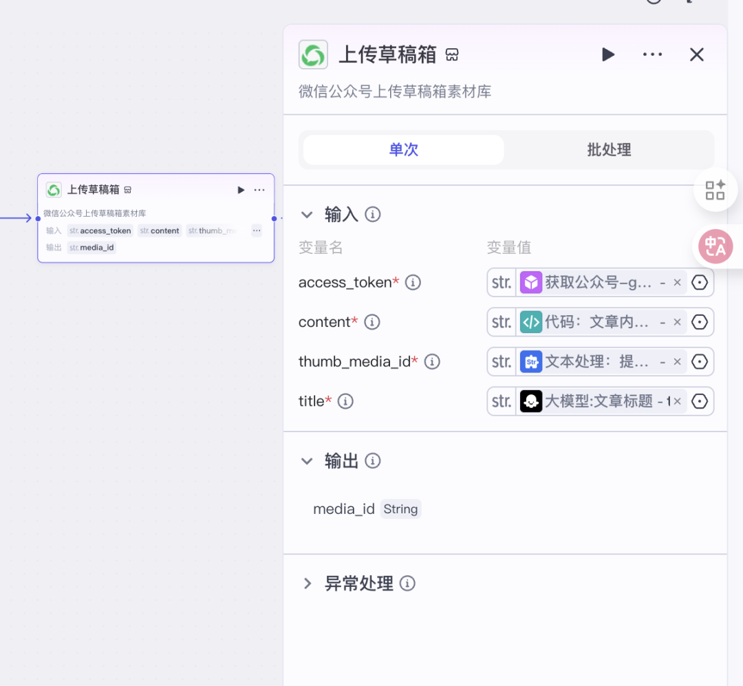 核心工作流:生成趣味故事脚本即梦4.0生图、组图打通公众号appid并保存到草稿箱工作流概览