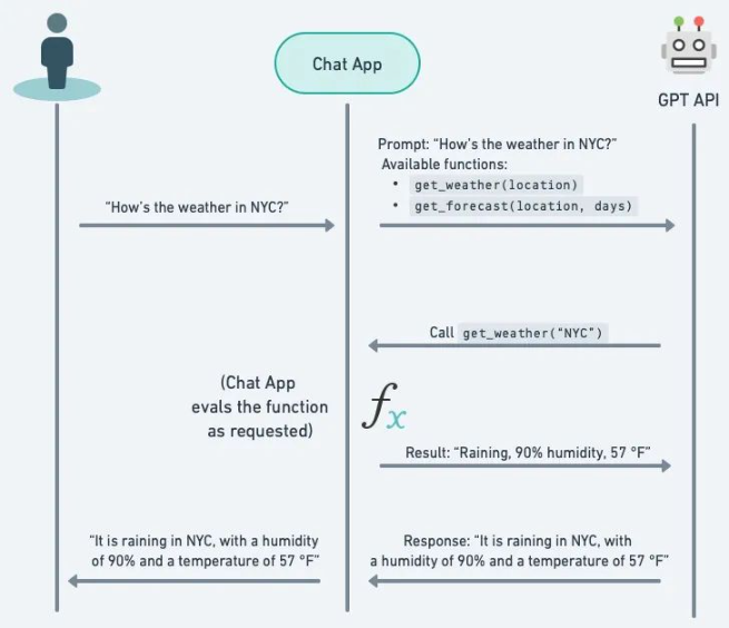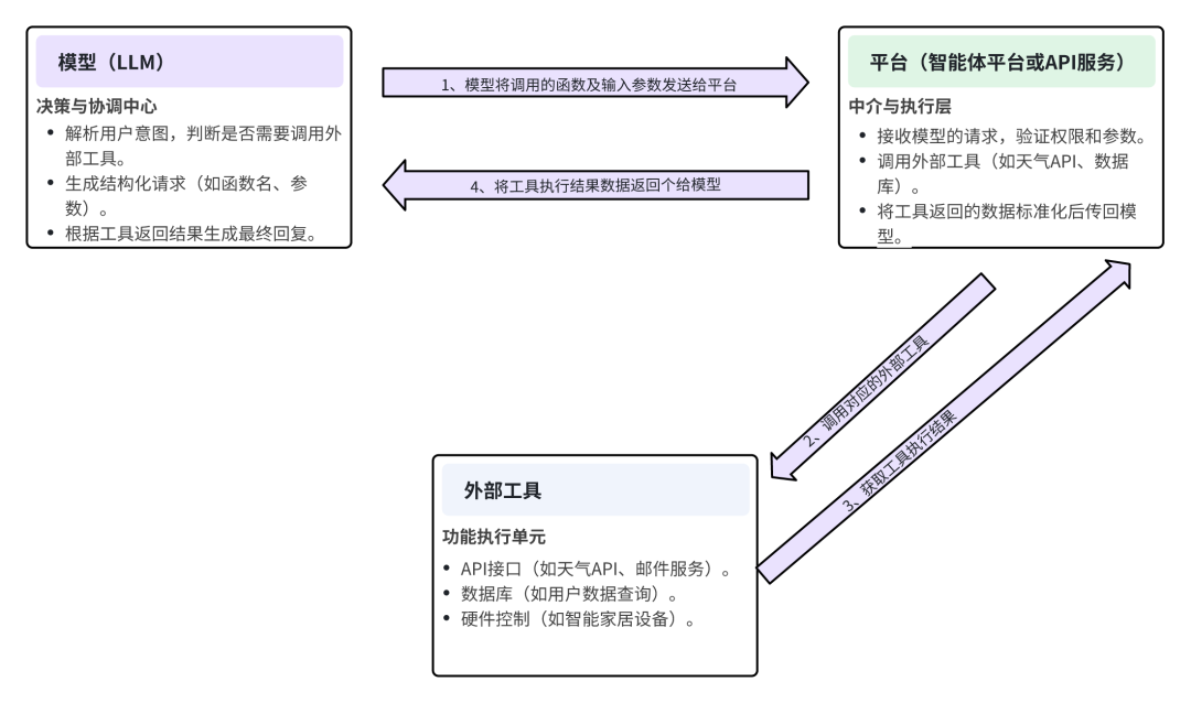 - 平台(如OpenAI的API、HuggingFace的推理服务)接收结构化请求,调用对应的外部工具(如天气API)。