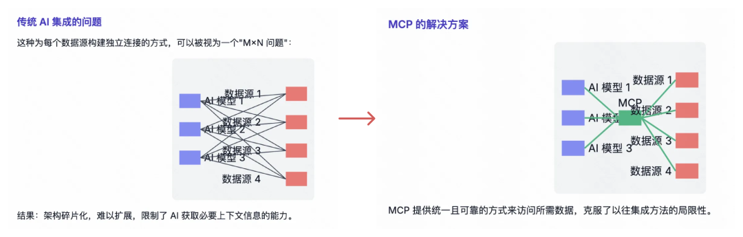 主要解决的痛点就是Function Calling存在的问题:每个AI提供商有自己的实现方式,缺乏通用标准,开发起来比较费力,并且有的模型是不支持Function Calling的(例如早期的deepseek r1)。