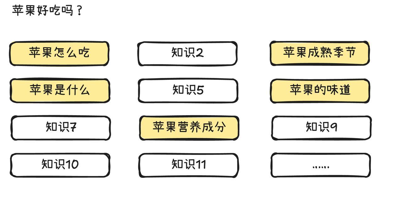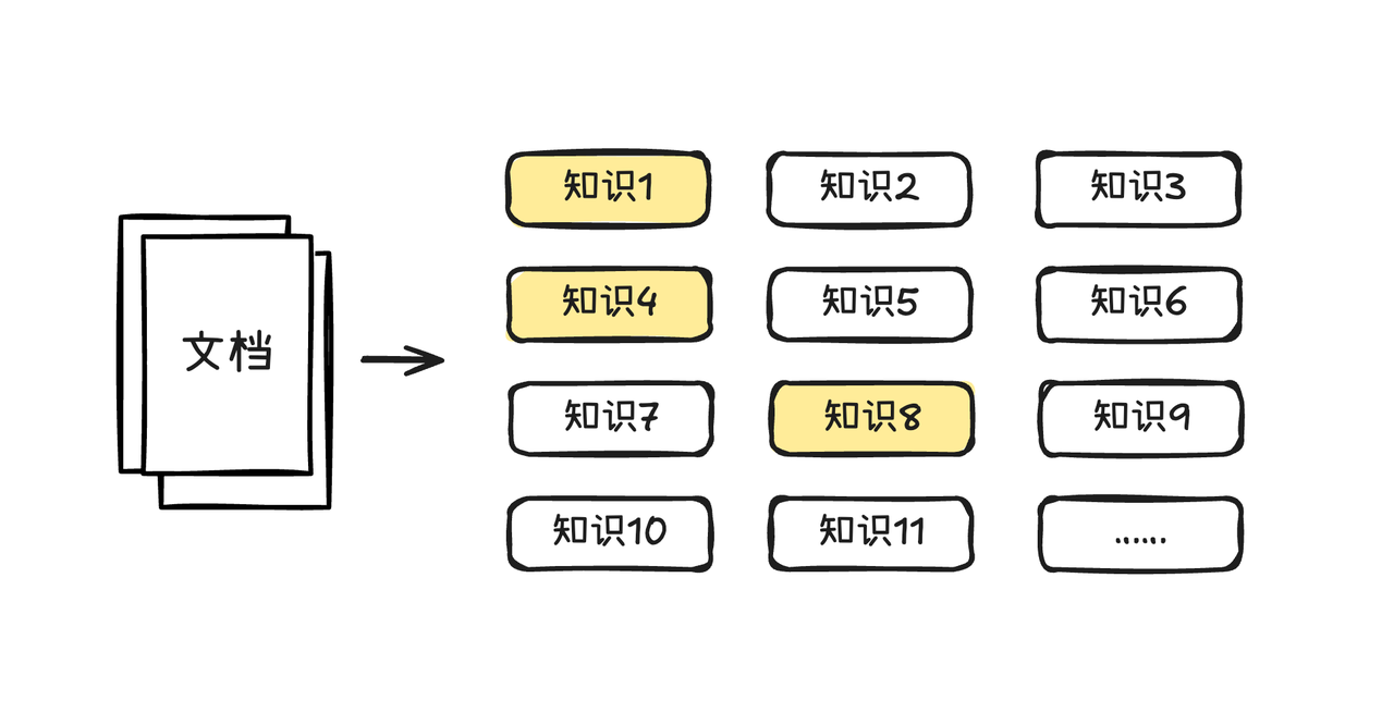 拆分完成后,当用户提出一个问题时,RAG系统会快速从成千上万个知识片段中,检索出与问题最相关的几个,比如知识1、知识4和知识8。
