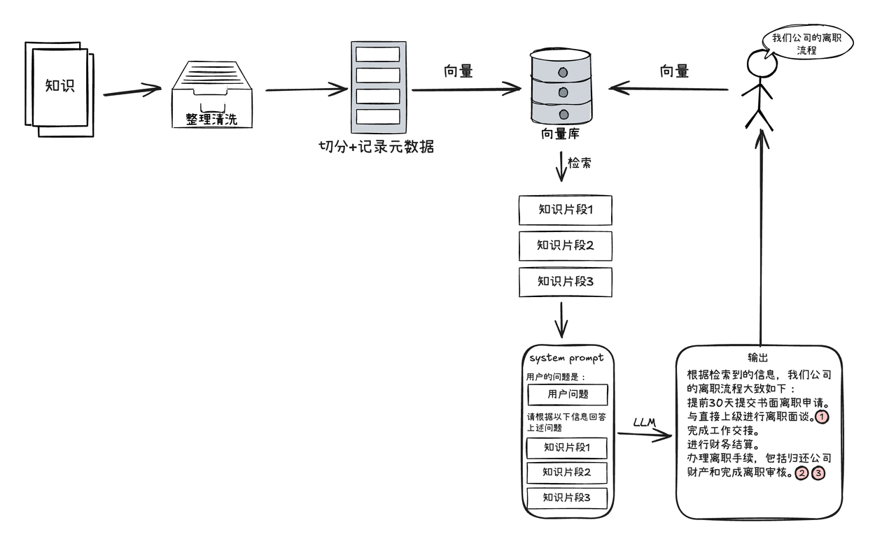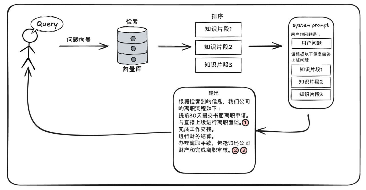 - 检索与生成:这是用户提问后的实时工作阶段,就像图书管理员去图书馆查资料给你找答案。
