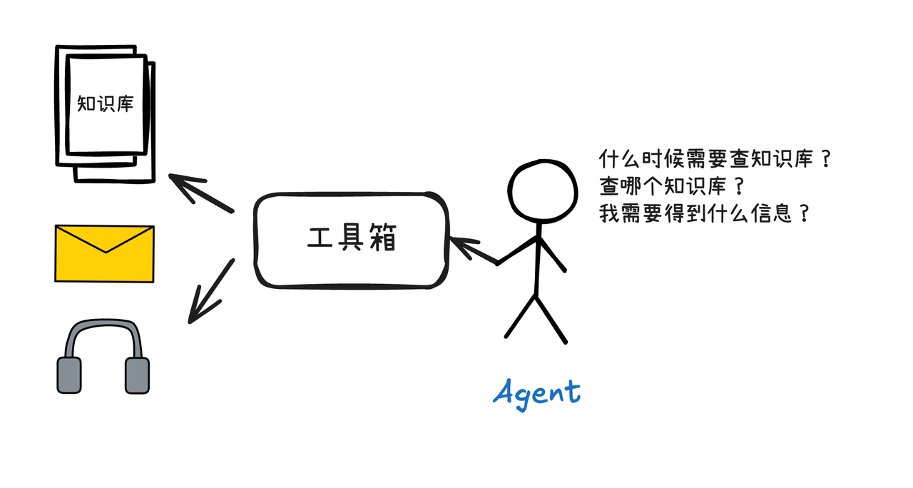 解决思路:我们赋予Agent一个大脑和一整个工具箱。RAG(内部知识库检索)只是其中一个工具。工具箱里可能还有: