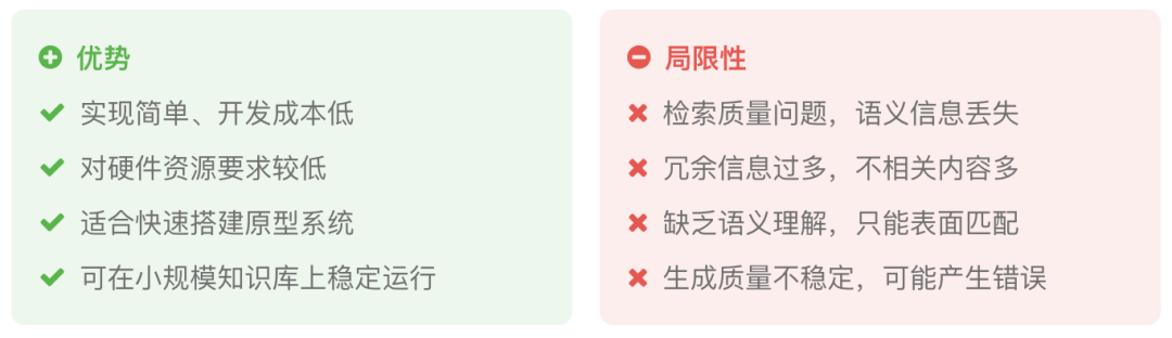 最基础的实现方式,采用标准的”索引-检索-生成”流程。架构简单、开发成本低,但存在文本分段不科学、检索相关性差、冗余信息多等问题,难以满足复杂场景需求。