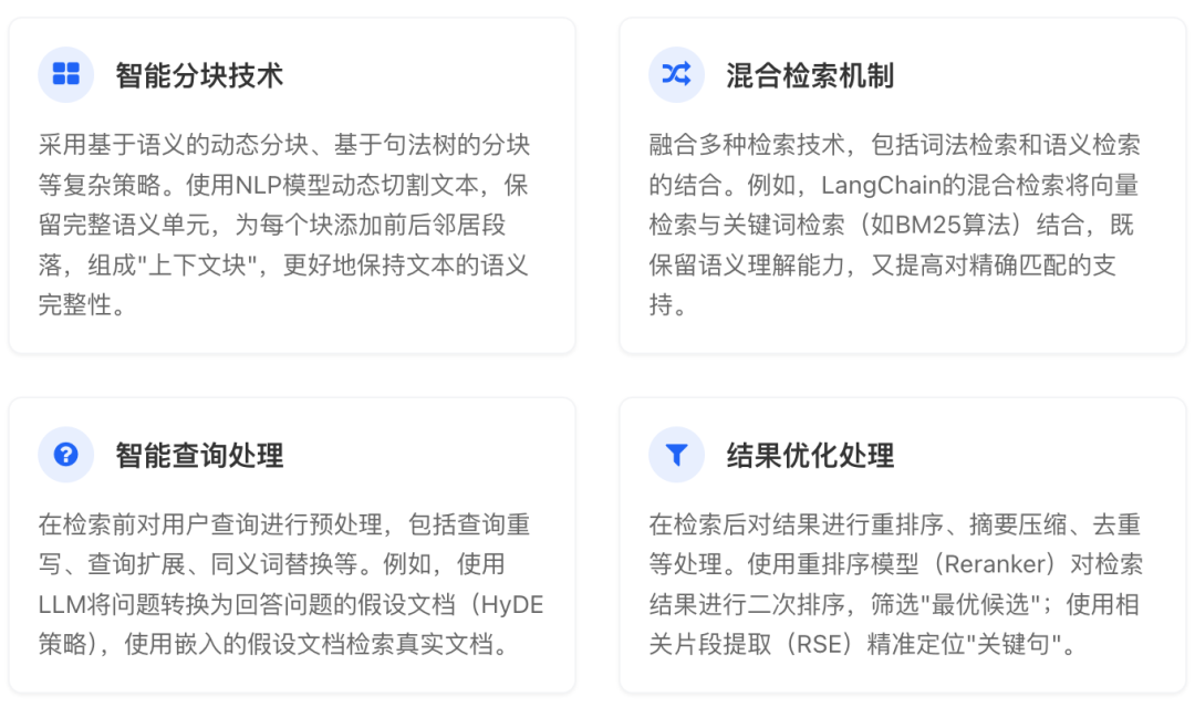 Advanced RAG通过引入多环节优化策略,显著提升了检索精度与生成质量。其核心改进体现在智能分块、混合检索、智能查询处理和结果优化四个方面。