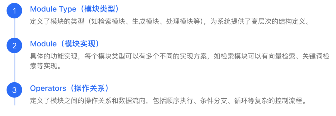 代表了RAG技术的最新发展方向,通过将检索与生成流程解耦为独立可复用组件,实现高度定制化。将系统分为Module Type、Module和Operators三层结构,支持根据任务需求灵活组装模块,特别适合复杂多变的业务场景。