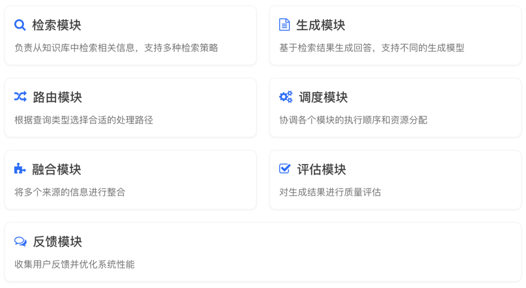 Modular RAG代表了RAG技术的最新发展方向,通过模块化设计实现了高度的灵活性和可扩展性。其核心架构包括三层结构设计和七大核心模块。