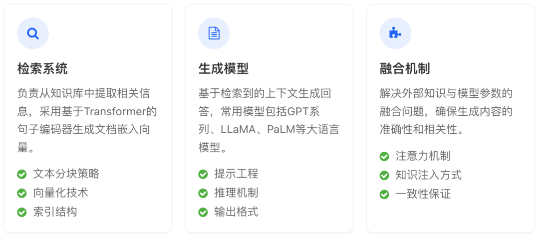 无论哪种RAG实现方式,都包含三个核心组件,这些组件的不同实现方式决定了整体架构的性能和特点。