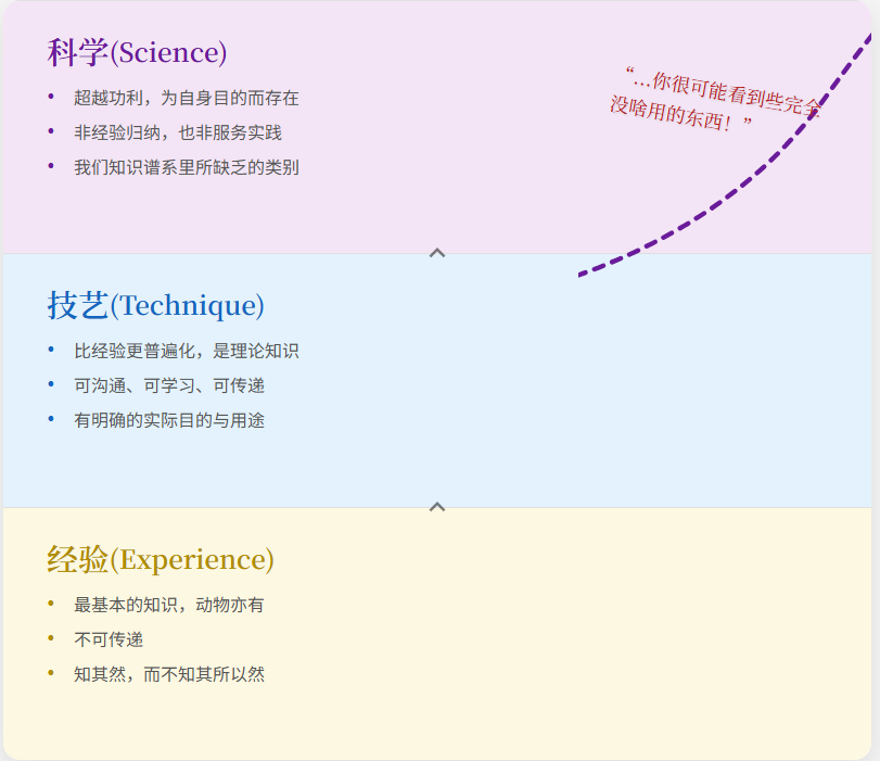 亚里士多德在《形而上学》第一卷开篇谈到三类知识,他认为最基本的知识是经验知识,动物都有经验,但是经验不可传递,所以是知其然不知其所以然的知识。亚里士多德认为比经验更高的知识叫技艺或者技术,这一类知识就有点类似于中国人心目中的理论知识,比经验知识更加普遍化,它能够沟通、能够学习。