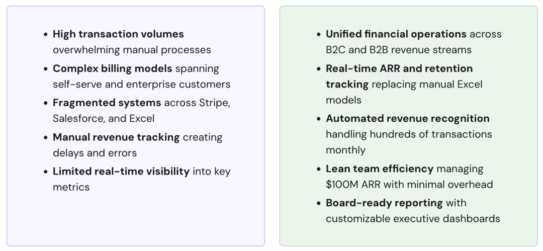 1)交易、收款等数据分散在Salesforce、Stripe等SaaS软件,导致巨大的手工核算量