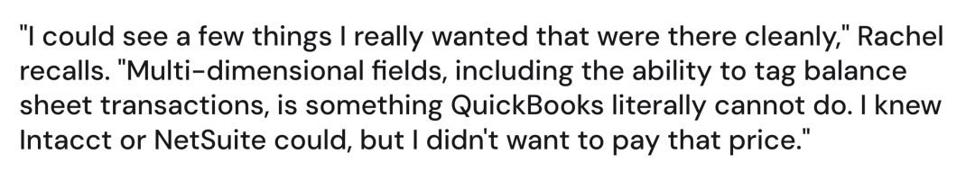 比如,AidKit公司的财务总监就很直白的说:Rillet的优势就在于,它能提供QuickBooks提供不了的功能,但是又比NetSuite便宜。