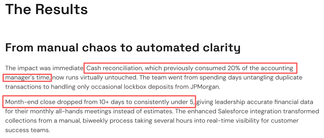 在官网客户案例中,这个亮点也被频繁提到。比如Turquoise Health的财务负责人就声称:上线Rillet以后,自动对账节约了财务经理20%的时间,月结时间也从10天以上缩短到5天以下。
