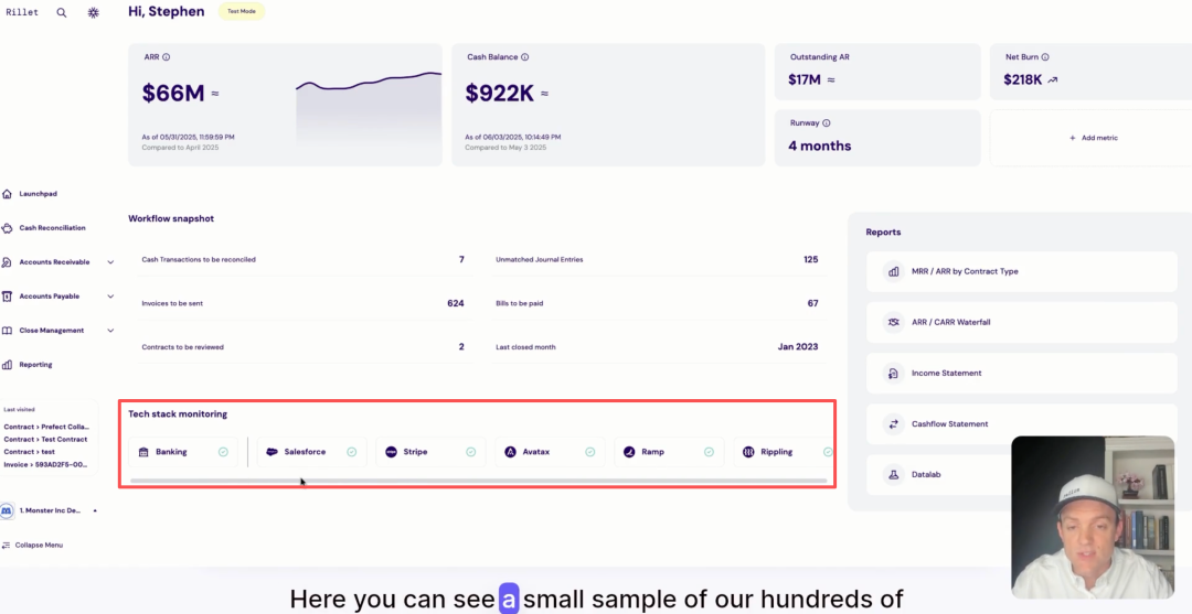 首先,他集成了几百个SaaS软件,包括Salesforce、Stripe等,大大减少了手工核算量。
