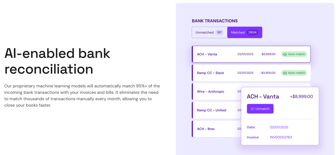 比如,为了确保收款的准确性,财务人员需要把销售发票和收款进行准确匹配。销售发票由Rillet生成,但是收款则来自于Stripe等支付系统。只有通过AI算法,才能够准确匹配来源于两个系统的异构数据。