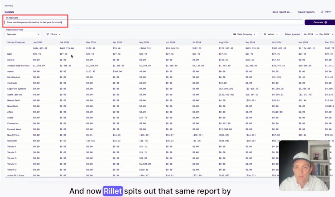 比如在下图中,Rillet的CFO就演示了如何通过自然语言自动生成报表。