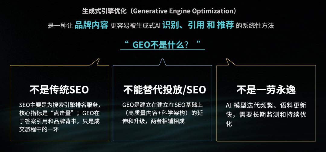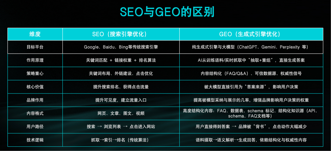 不同于传统 SEO 依赖关键词和外链,GEO 关注的则是在生成式搜索引擎回答用户问题时,企业的内容能否被准确引用和呈现。