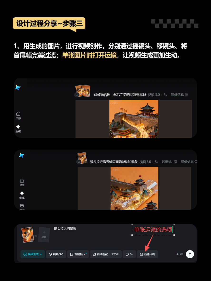 打开即梦,运用视频生成功能,给它输入你想要它运动的方式,当想要单张的图片运动时,记得运用即梦的单张运镜功能,这样可以获取更加生动的动画。