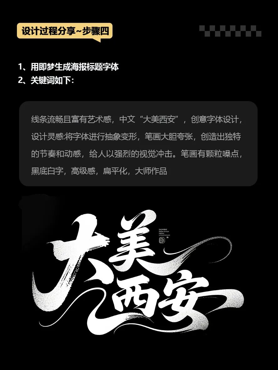 线条流畅且富有艺术感,中文“大美西安”,创意字体设计,设计灵感:将字体进行抽象变形,笔画大胆夸张,创造出独特的节奏和动感,给人以强烈的视觉冲击。笔画有颗粒噪点,黑底白字,高级感,扁平化,大师作品