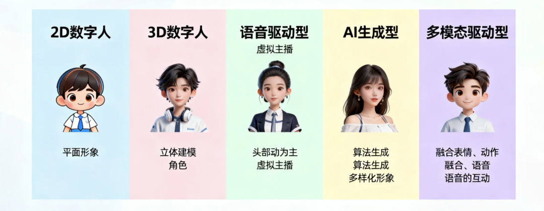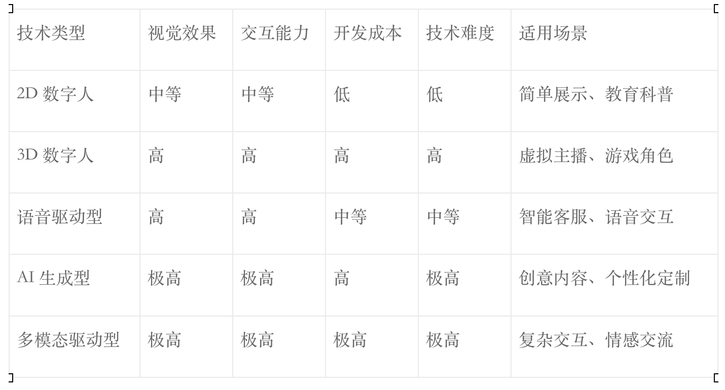 不同类型的数字人技术在应用场景、技术复杂度、成本效益等方面存在显著差异,选择合适的技术方案需要综合考虑多个因素。