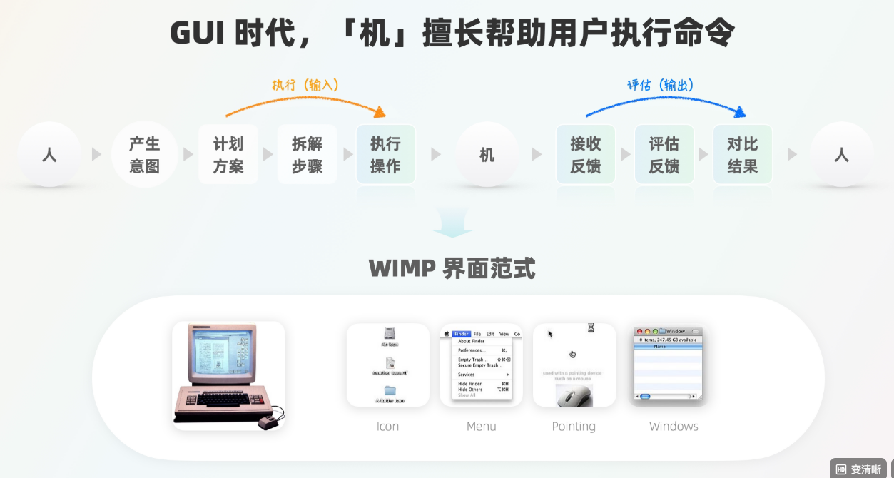在图像界面时代,WIMP 范式中的各个要素,主要作用于人机交互的「执行操作」与输出环节的相关节点: