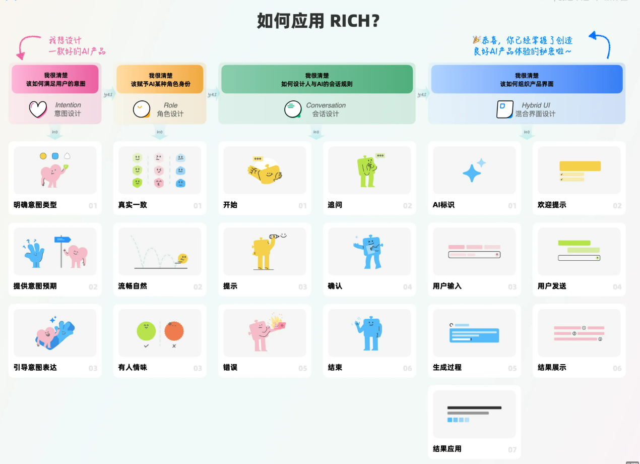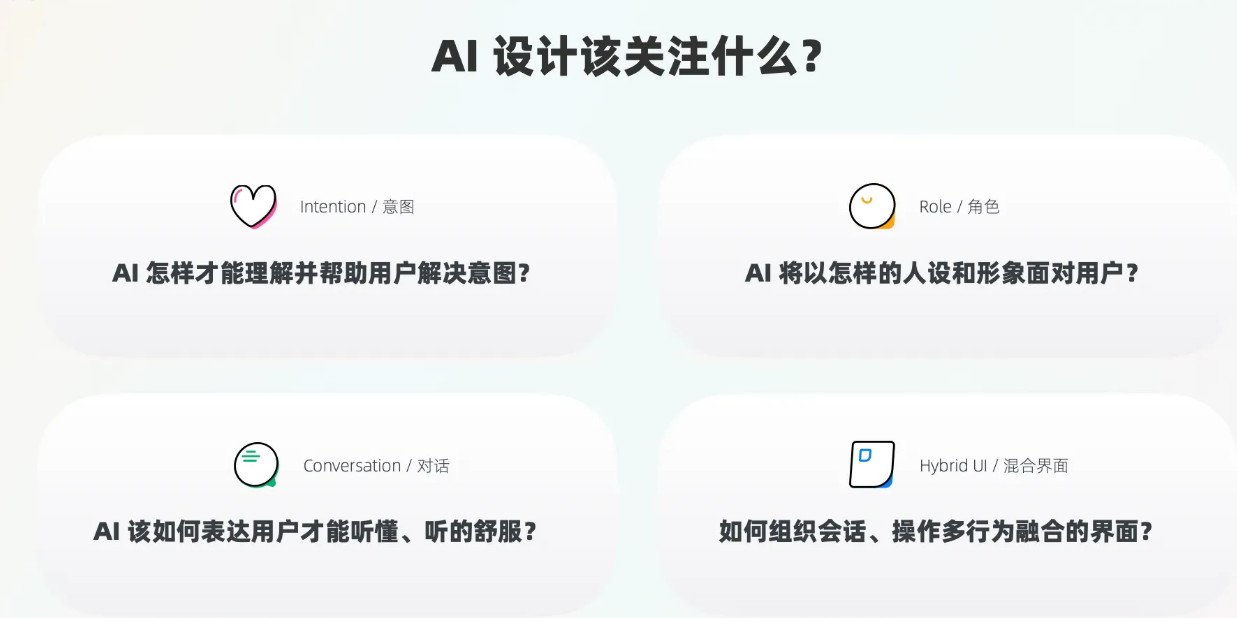 在这个新的体验环节中,增加了很多隐形的体验规则,过去只要 UI 界面组织的相对可用、美观,就能给用户带来较好的体验感受。但 AI 时代,体验还取决于机器是否听得懂我的意思,是否讲话比较好听等等一系列隐形的体验。因而针对这样一种新的交互特征,关键设计要素需要被重新抽象和定义,确保我们的设计关注点走在正确的方向上。