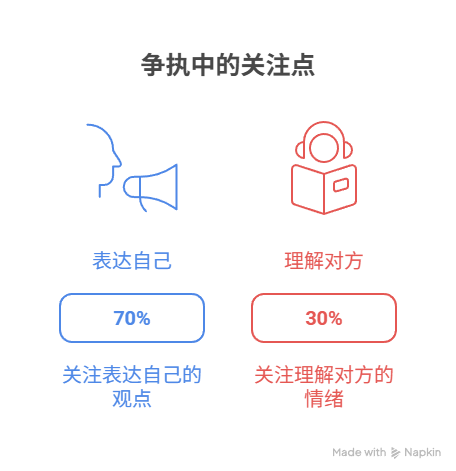 根据一项针对伴侣沟通模式的调查显示,在发生争执时,超过70%的人承认,他们更关注如何“表达自己的委屈或观点”,而不是“理解和接纳对方的情绪”。