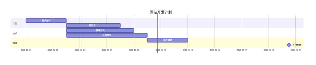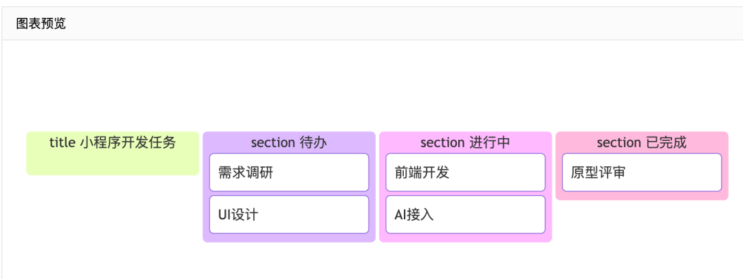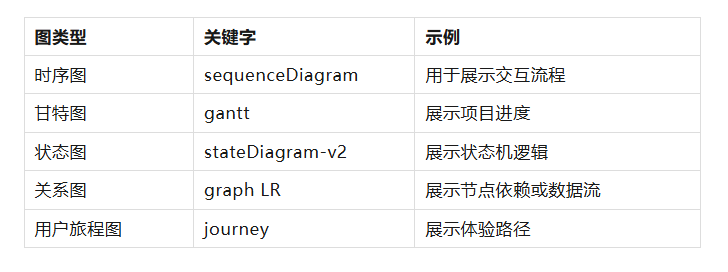 只要用几行语句,就能生成流程图、时序图、甘特图、状态图、用户旅程图等,非常适合: