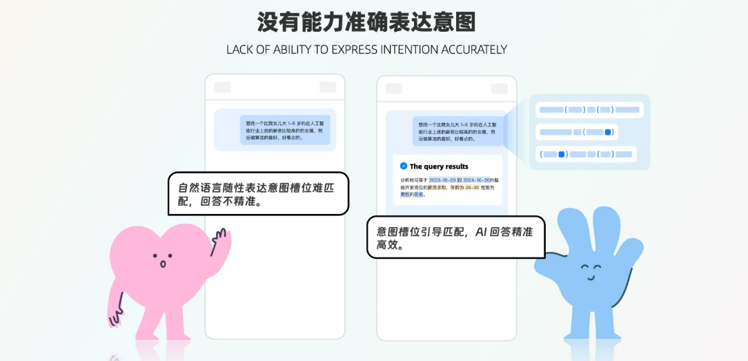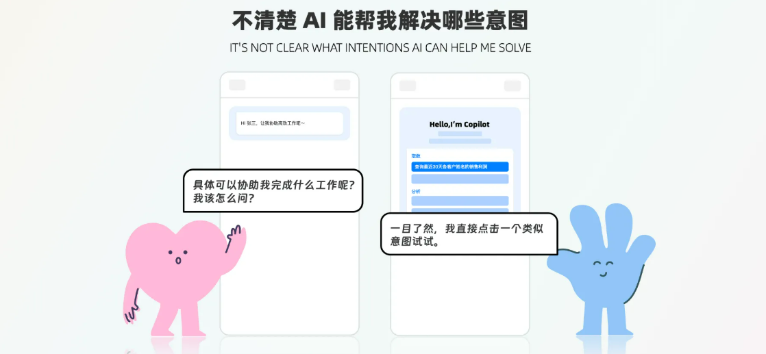 除了传统界面交互与会话式等交互界面范式的问题,通过调研我们还发现:大部分用户对于 AI 产品存在认知盲区,即不清楚 AI 能帮我实现哪些意图,以及往往没有能力准确表达意图,这在一定程度上阻碍了 AI 的有效应用。因此,如何提升用户对 AI 能力的认知,并设计出让用户能轻松准确表达意图的界面,成为当前 AI 设计领域待解决的重要课题。
