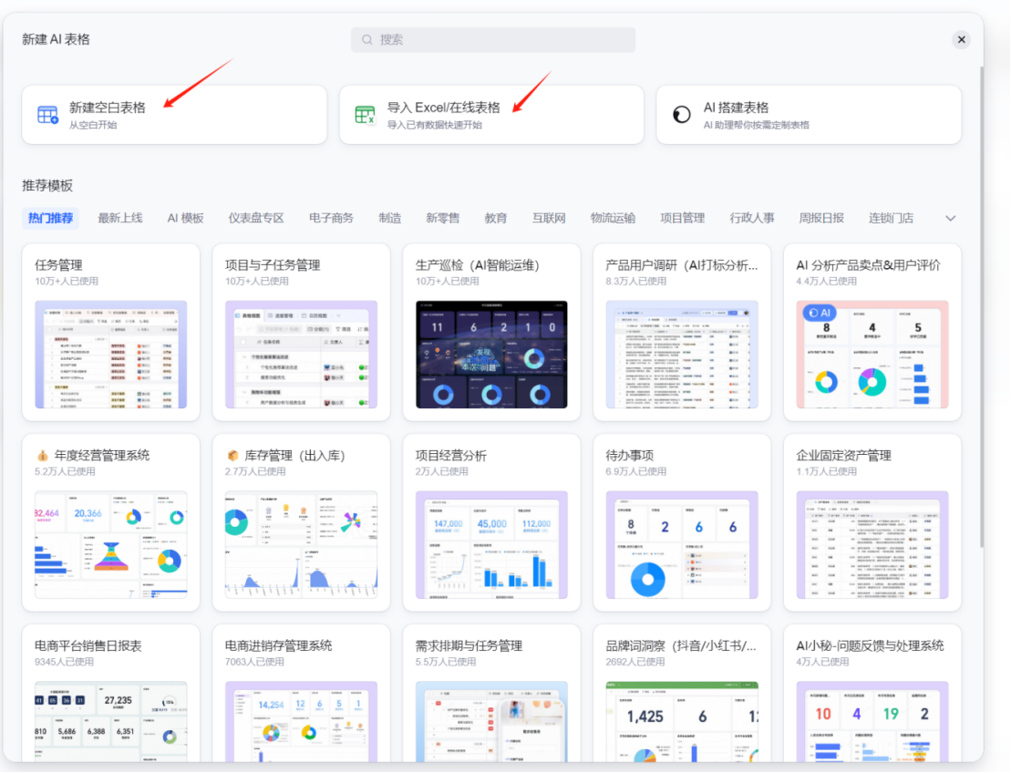 - 新建空白表格:用户可以完全自定义列和字段,满足个性化的业务需求;