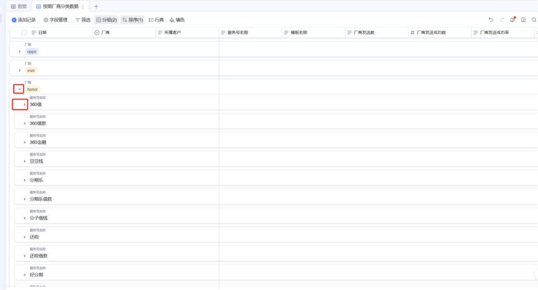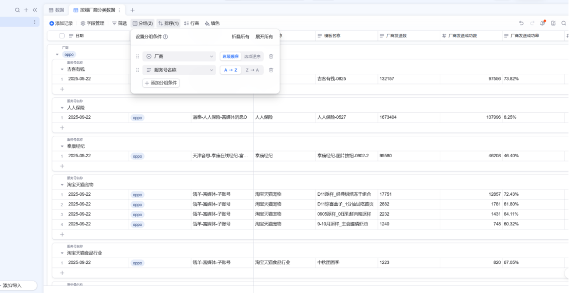 而在钉钉AI表格里,只需点击 分组 → 选择厂商 → 添加分组条件 → 选择服务号,短短两三秒即可完成。