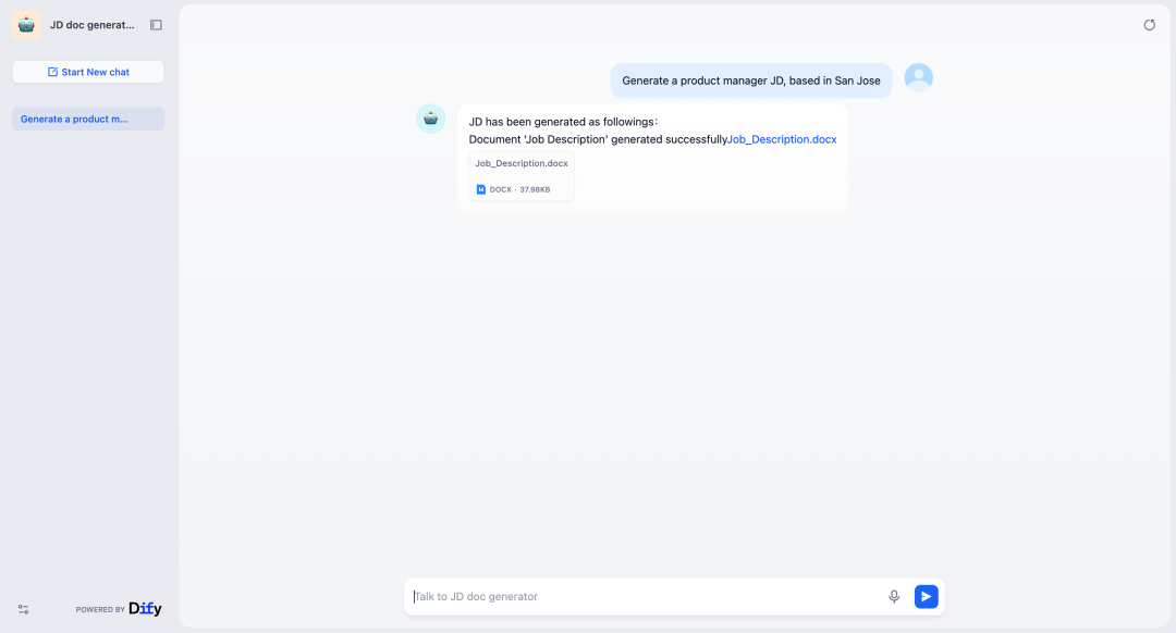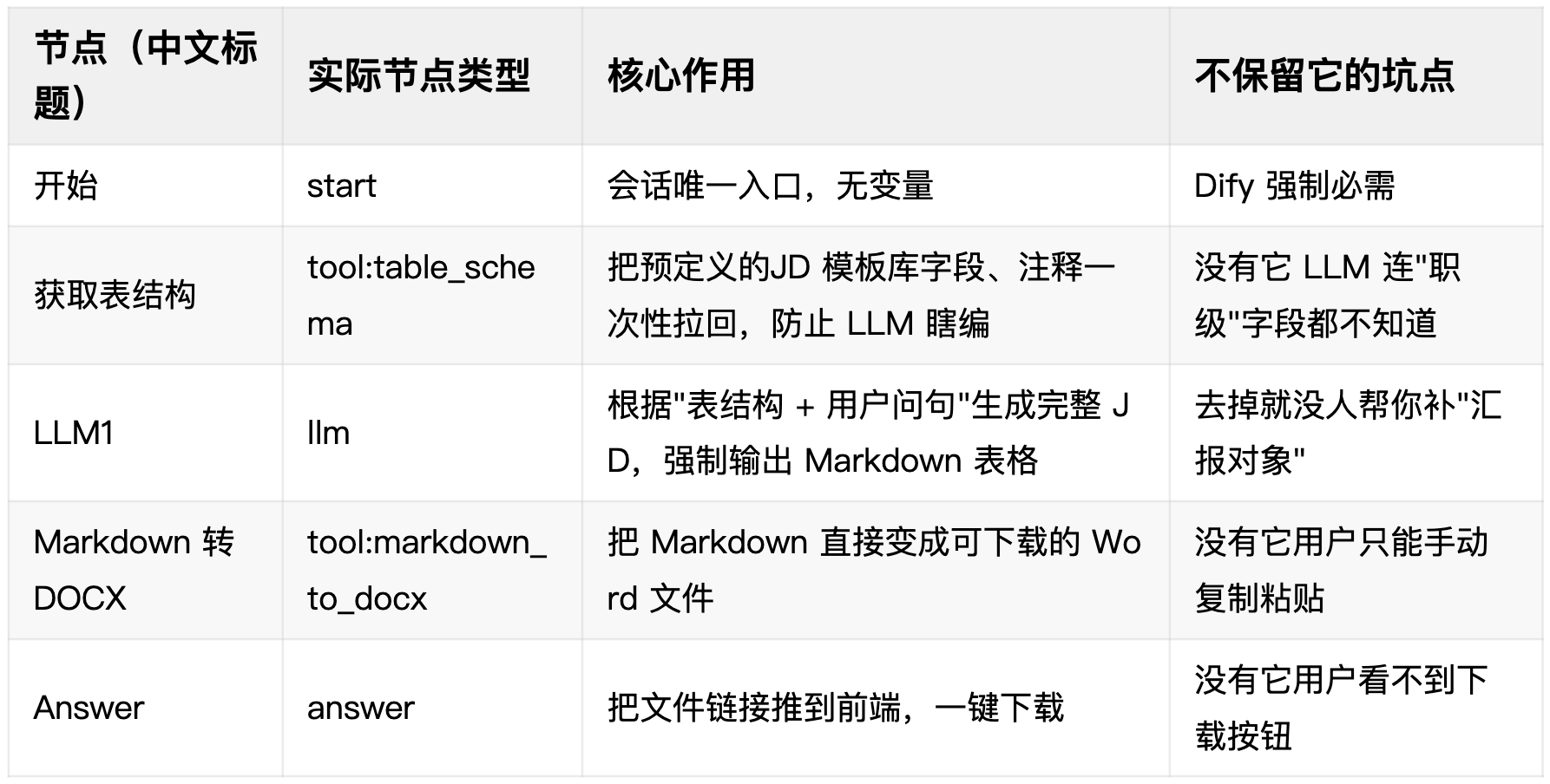 这个时候,HR多需要一个助手能快速生成专业的岗位描述文档啊。为了解放HR的生产力,我们来搭建一个Dify智能体,实现”一句话生成岗位描述(JD)文档”。
