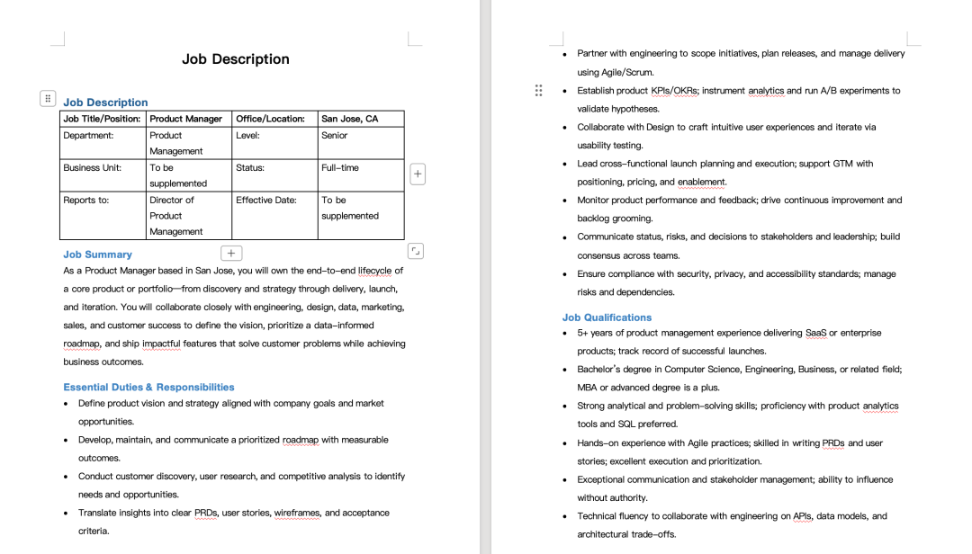 - HR:找业务部门要岗位信息,反复沟通确认职责要求,然后手动整理成标准JD文档。