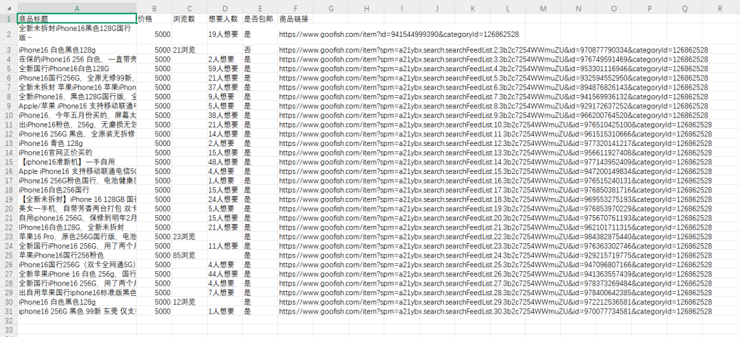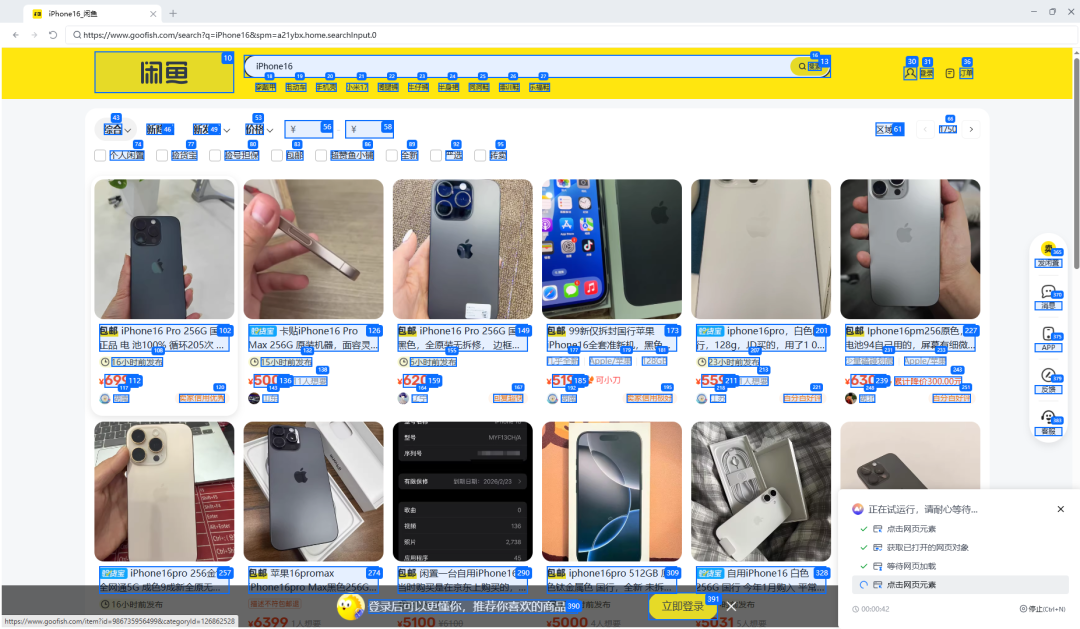 打开咸鱼网站https://www.goofish.com/,搜索iPhone16, 点击新发布,选择“一天内”,点击价格,选择“价格从低到高”,进入详情页采集商品内容,价格,浏览数,想要购买的人数,是否包邮等信息,保存到excel文档