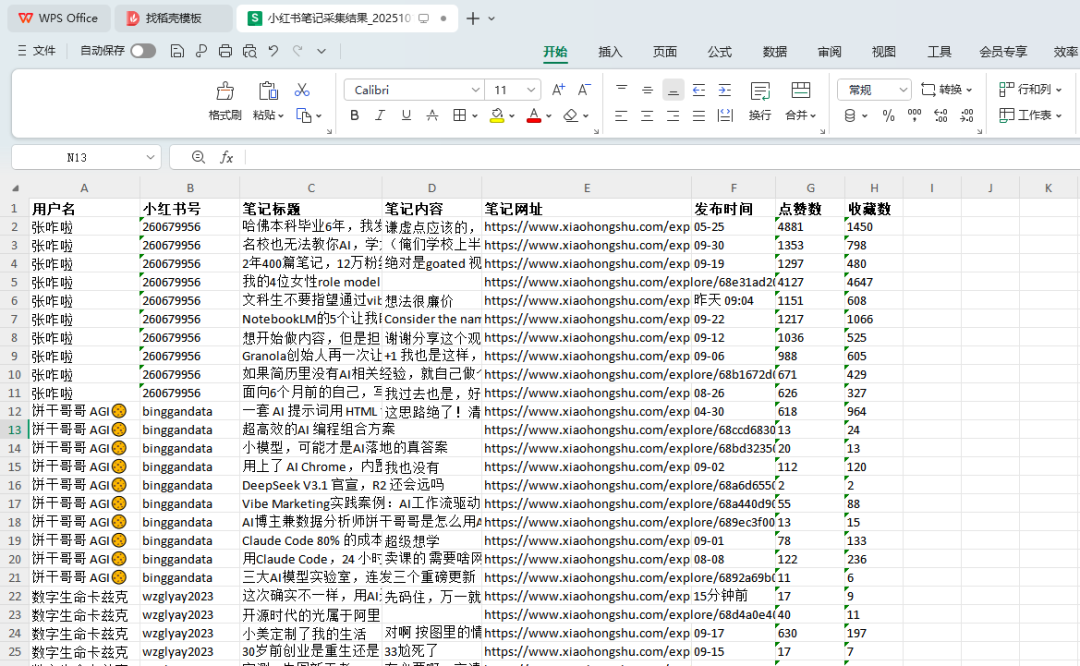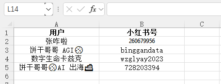 表格有两列:用户、小红书号,其中表格第一行是列名,要从第二行开始逐行进行遍历,用表格中的」小红书号」列的值到 https://www.xiaohongshu.com 搜索用户,读取当前博主最近的10条笔记标题、内容、网址、发布时间、点赞收藏等数据。