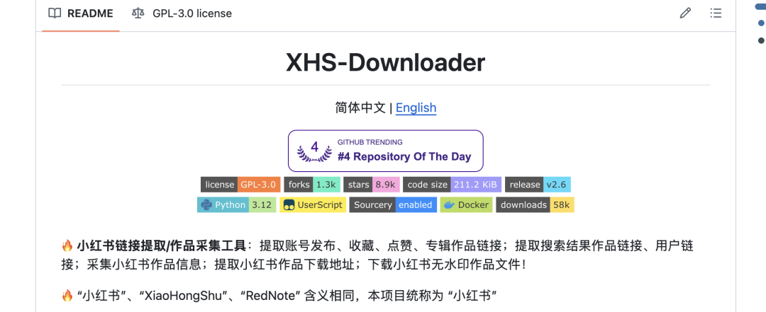就在我快要放弃的时候,突然想起来我之前在Github上发现的一个开源项目:XHS-Downloader。这是一个专门用来下载小红书笔记数据的工具,非常稳定。
