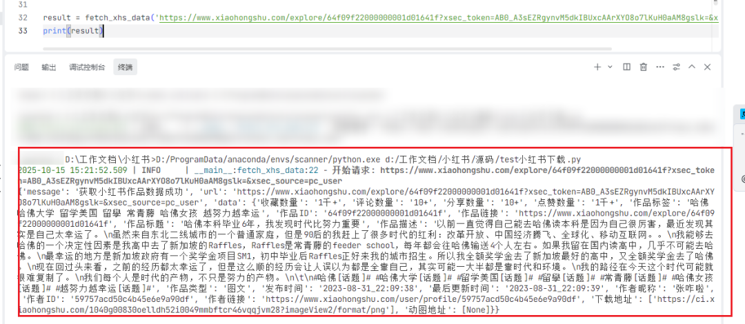 {‘message’: ‘获取小红书作品数据成功’, ‘data’: {‘收藏数量’: ‘1千+’, ‘评论数量’: ’10+’, ‘分享数量’: ’10+’, ‘点赞数量’: ‘1千+’, ‘作品标题’: ‘哈佛本科毕业6年,我发现时代比努力重要’, ‘作品描述’: ‘以前一直觉得自己能去哈佛读本科是因为自己很厉害。’作品类型’: ‘图文’, ‘发布时间’: ‘2023-08-31_22:09:38’, ‘下载地址’: [‘https://ci.xiaohongshu.com/imageView2/format/png’], ‘动图地址’: [None]}}