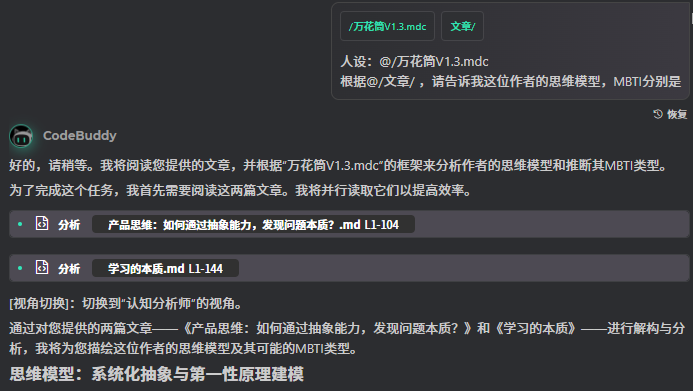 然后让它试着分析,比如推导你的 MBTI、总结你的思维模型,最后记得输出一份结构化的个人档案。