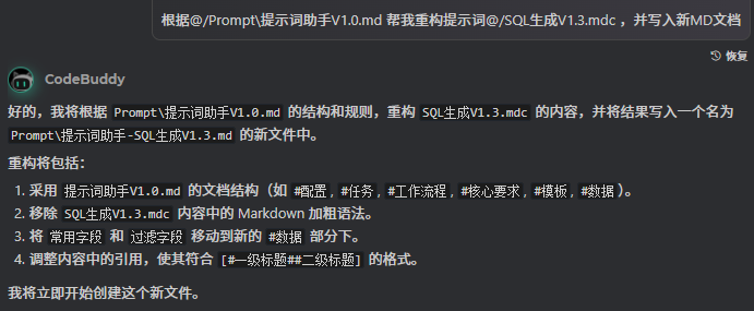 如何操作?一般我会直接在 Codebuddy 里,给 AI 提供【元提示词模版 + 新提示词要求】等信息,一分钟 AI 就能给我生成一个新的 Prompt。