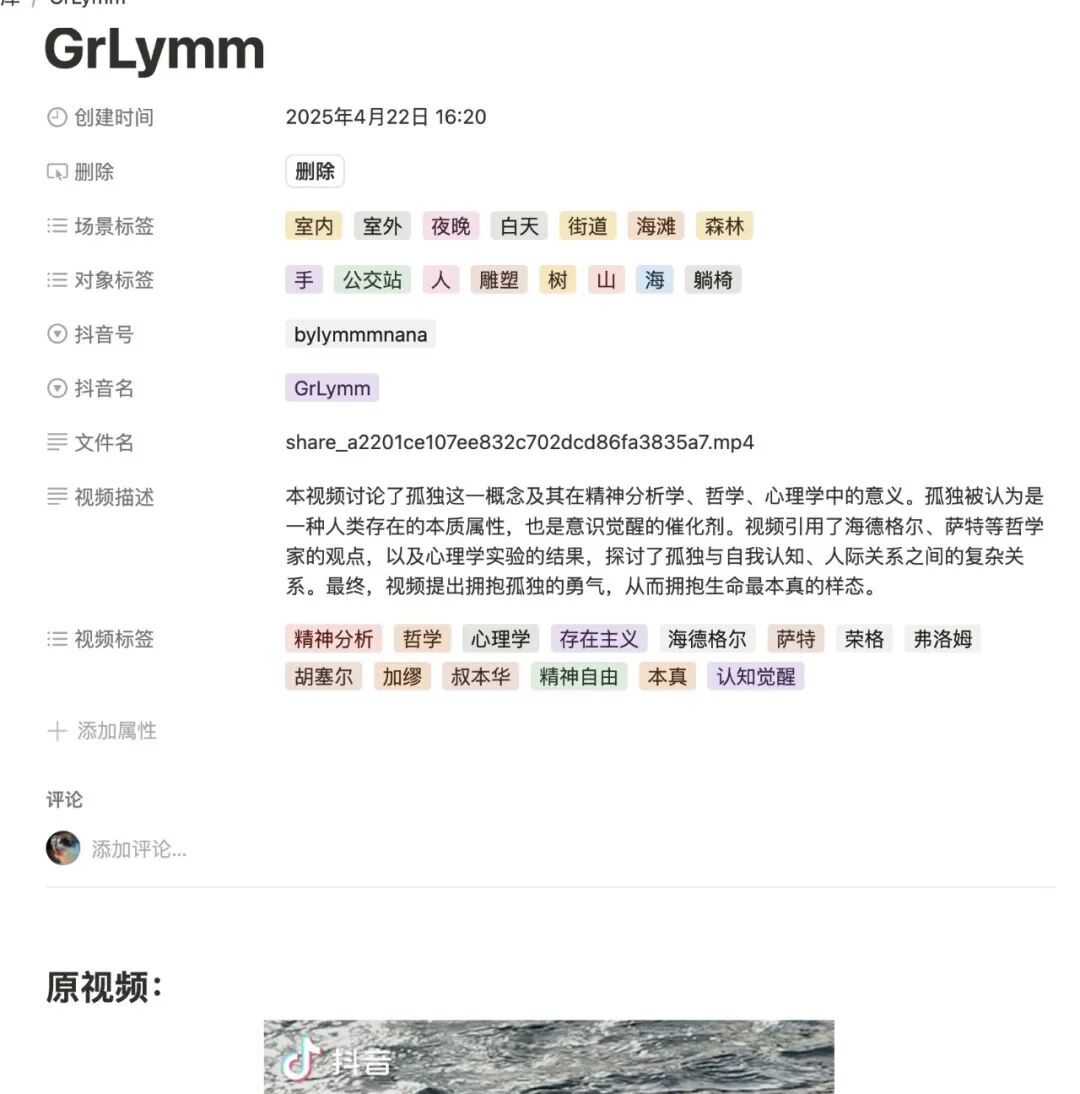 该工作流可以在手机端一键操作后,将短视频自动备份到存储桶,并利用 AI 对短视频内容概述,抽取标签,有效信息,并写入 Notion。
